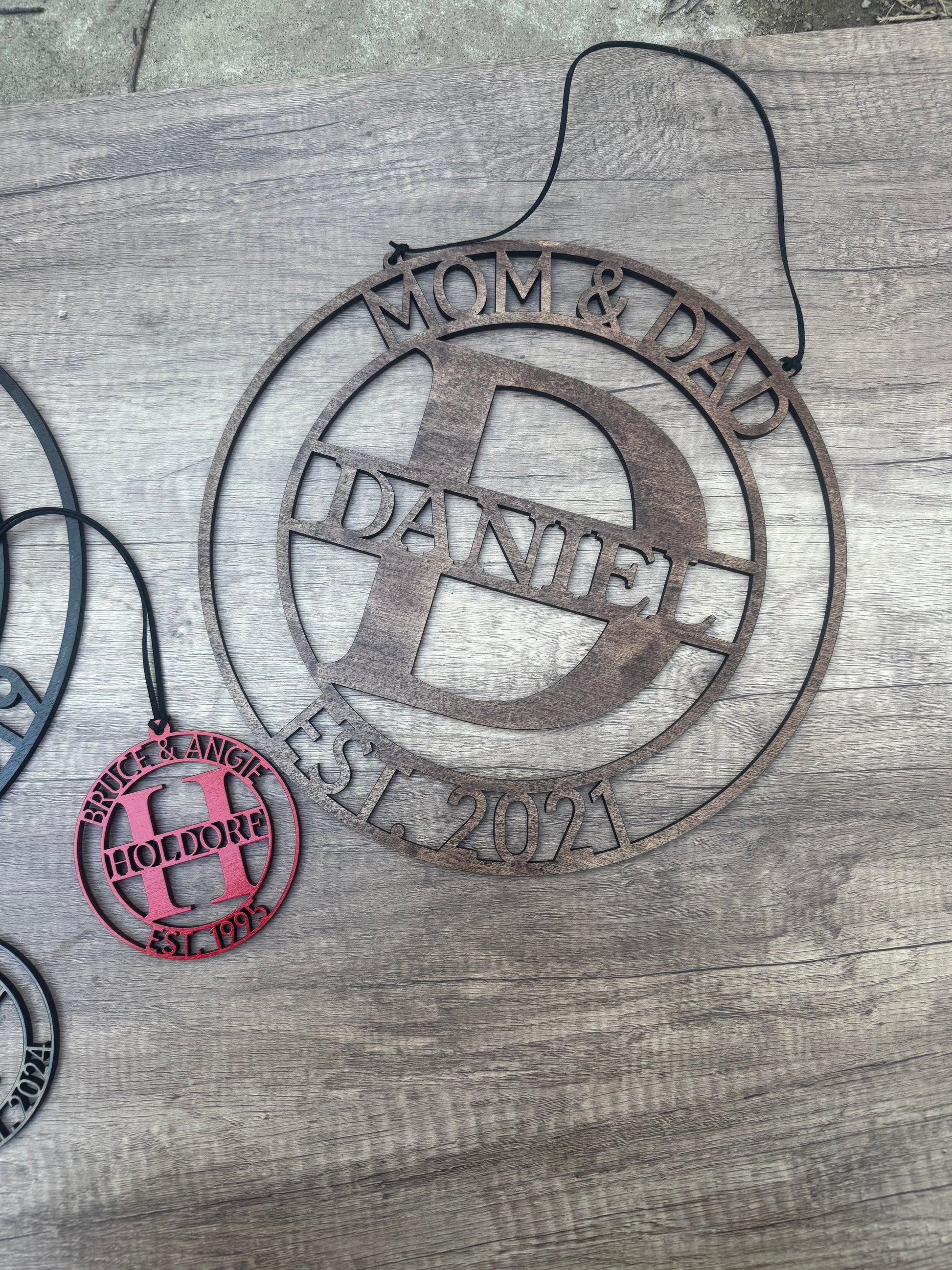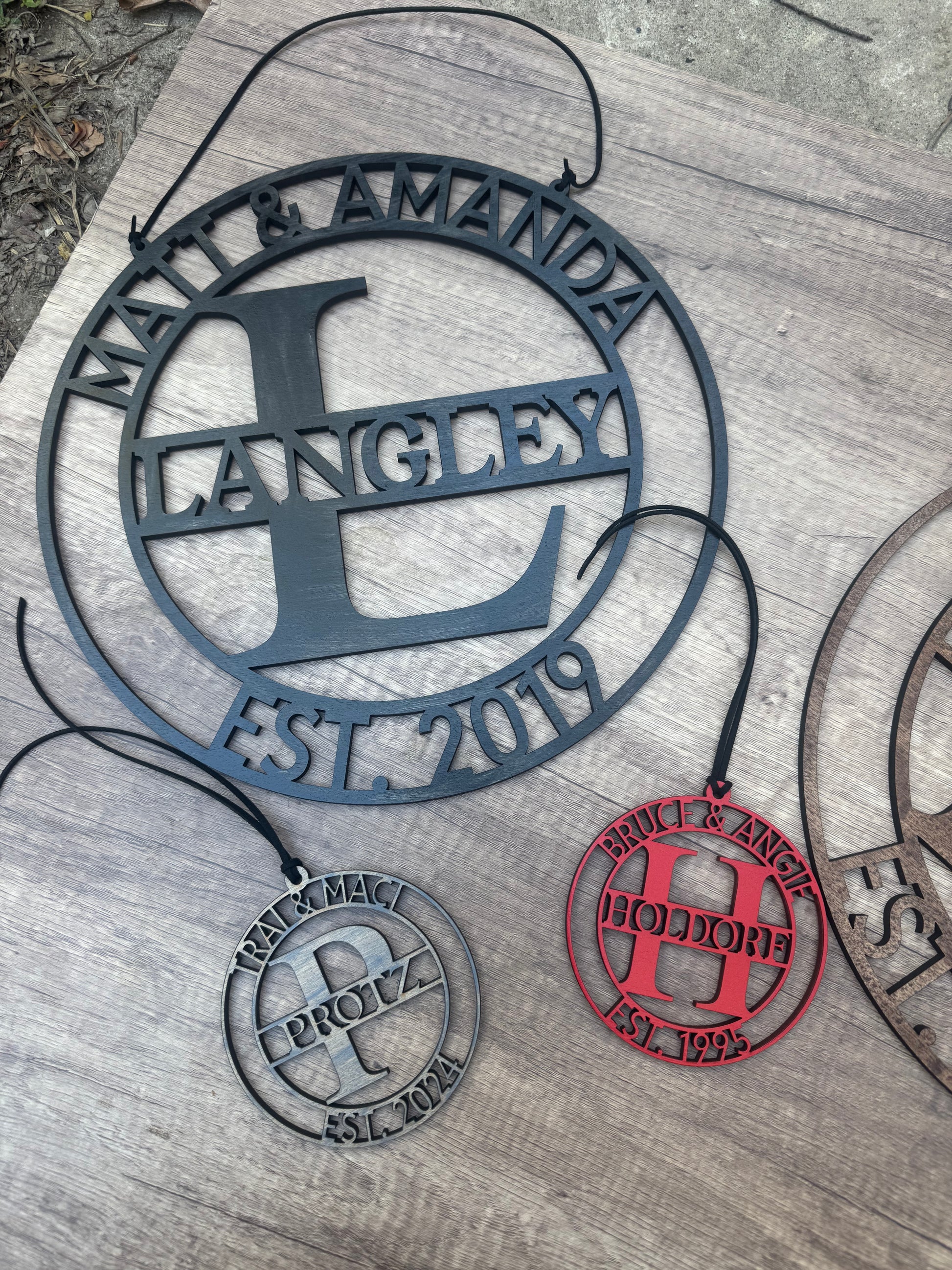 to customize your hanger, the top of the round are the couple’s first names. The middle is the last name and on the bottom is the established year.