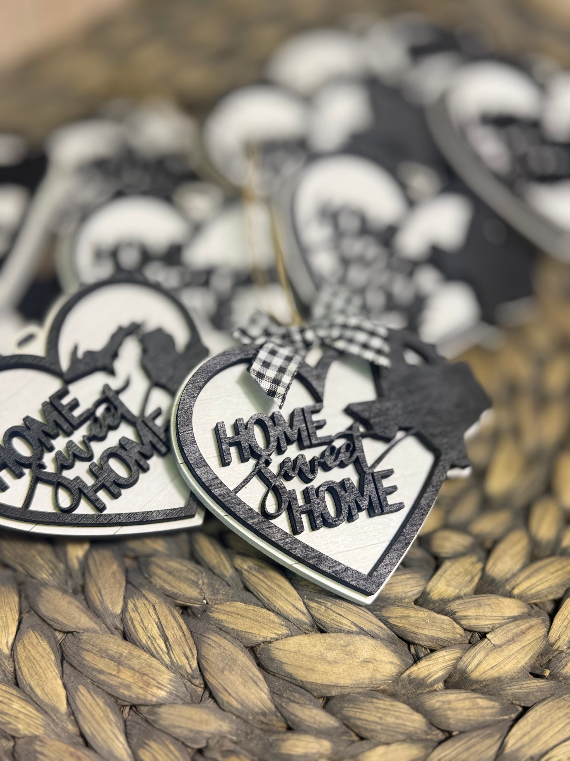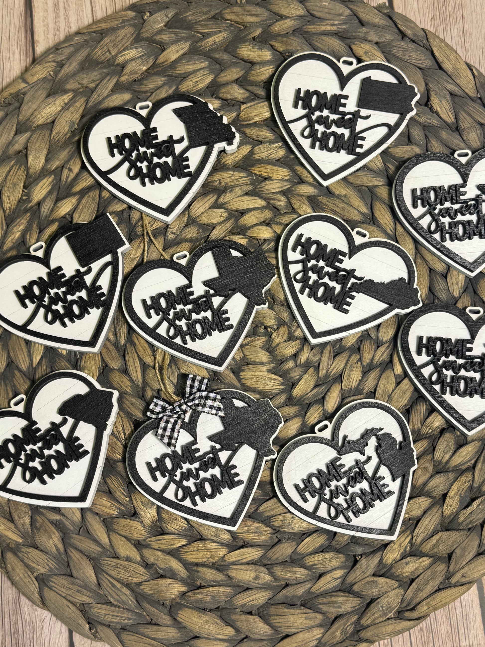 home sweet home state ornaments measure round 4” me are made from 2 layers of wood. All 50 US states are available.