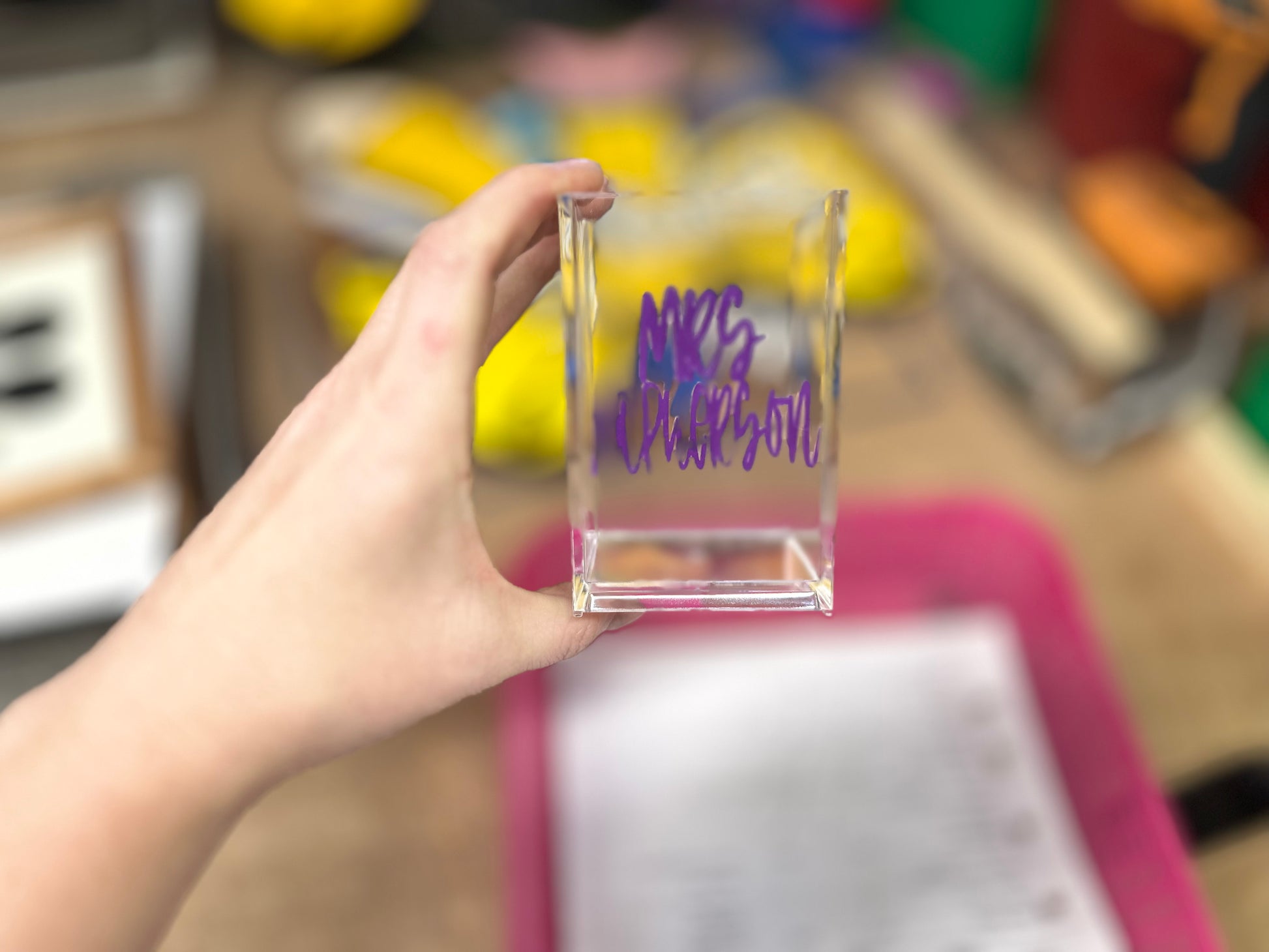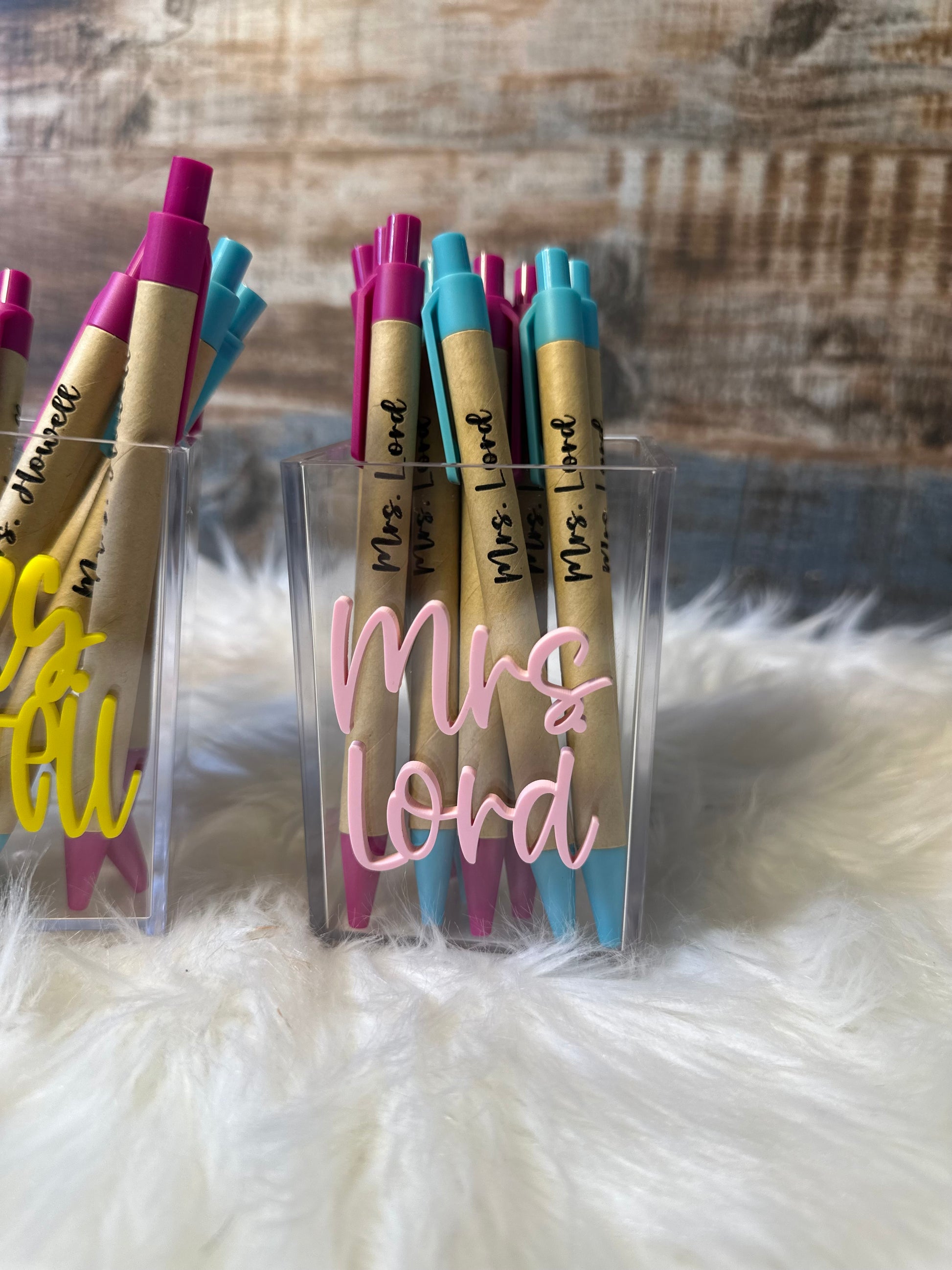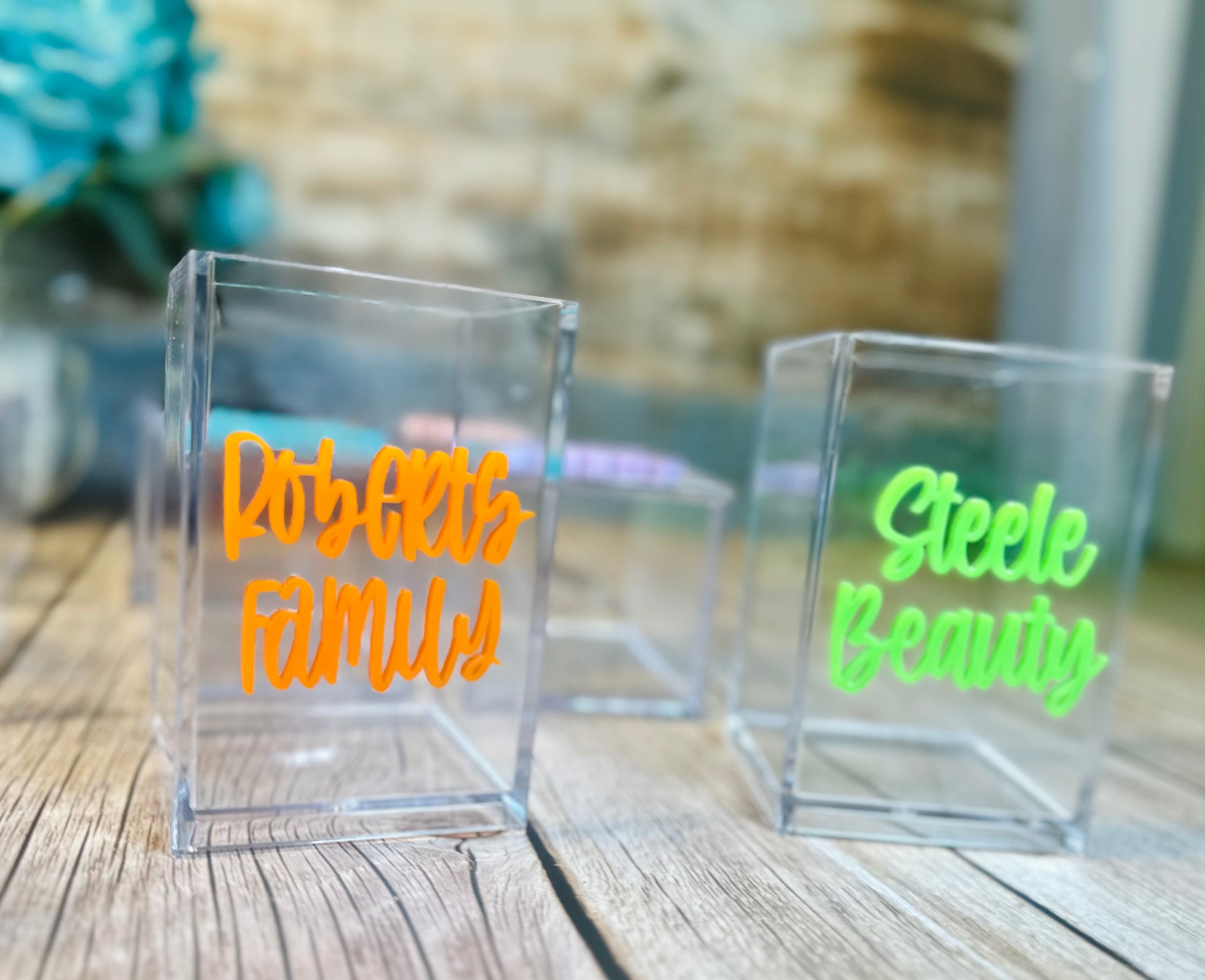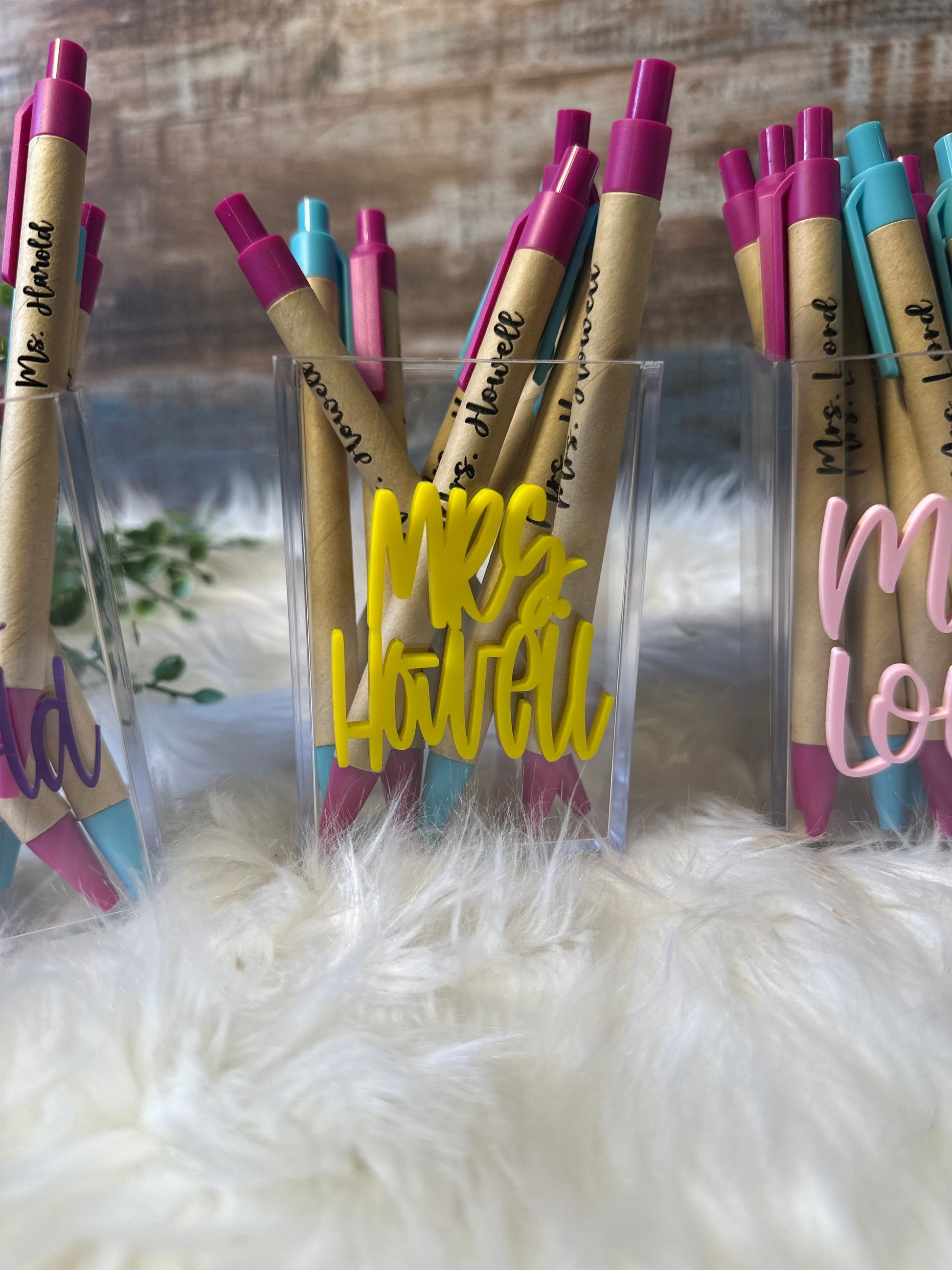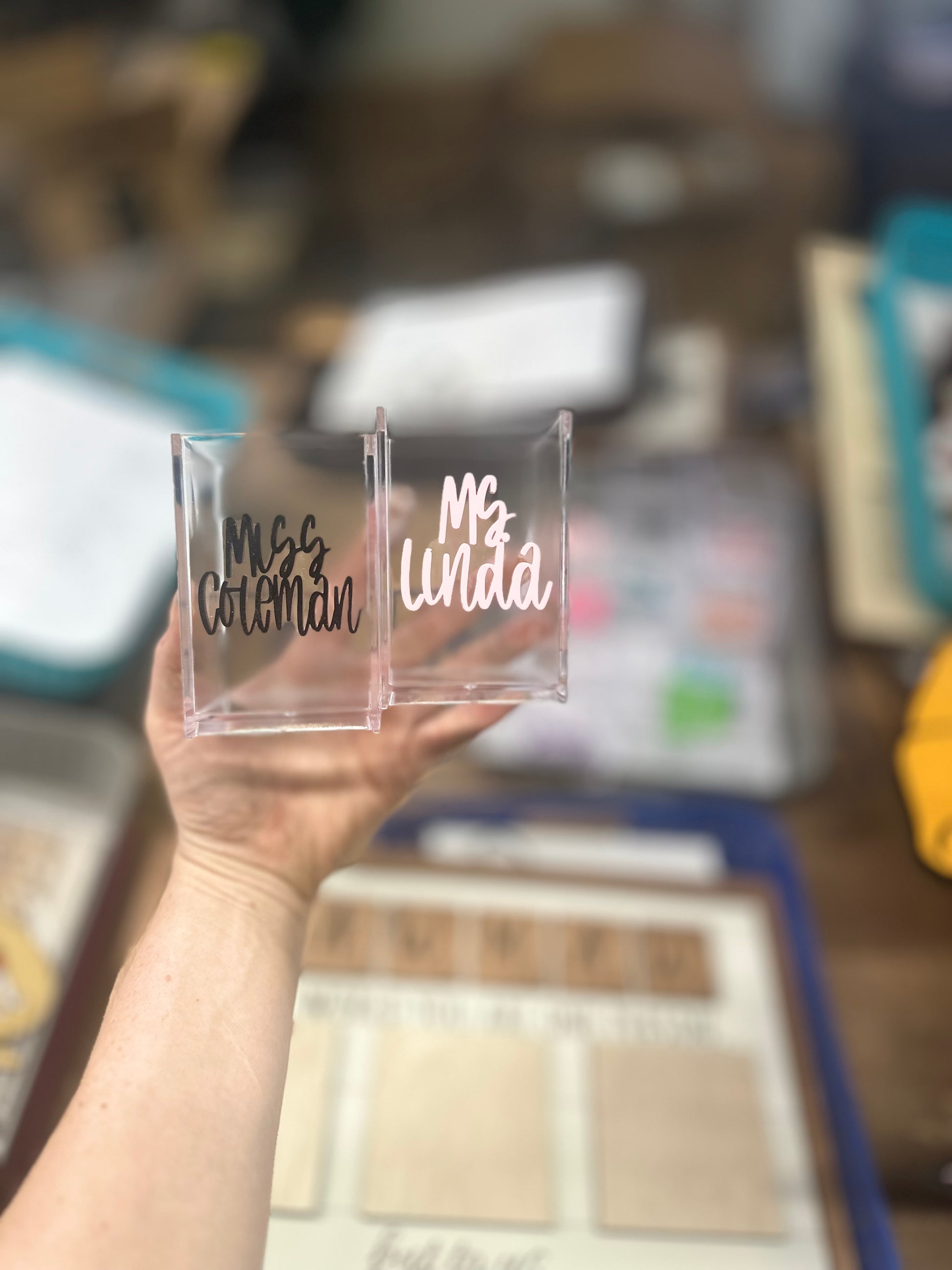 These adorable clear acrylic pen holders Measures 2.5” wide by 4” tall! Personalized with a teachers name, business name, etc! Choose the color of acrylic you’d like from our acrylic chart! Choose from the fonts below.Â