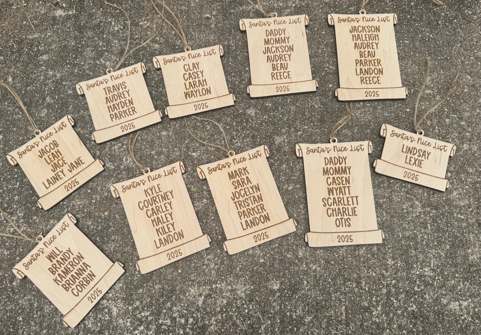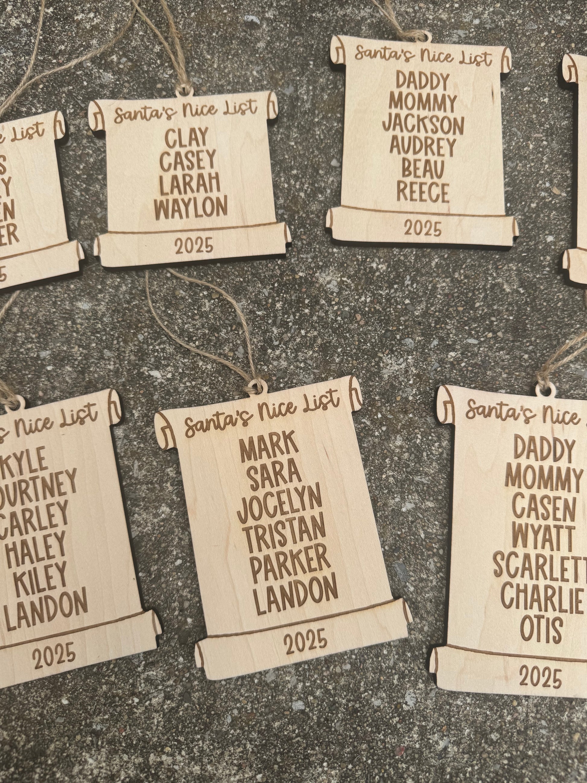 Laser engraved on maple wood. No max on names but please keep in mind the more names added the longer the ornament will be!