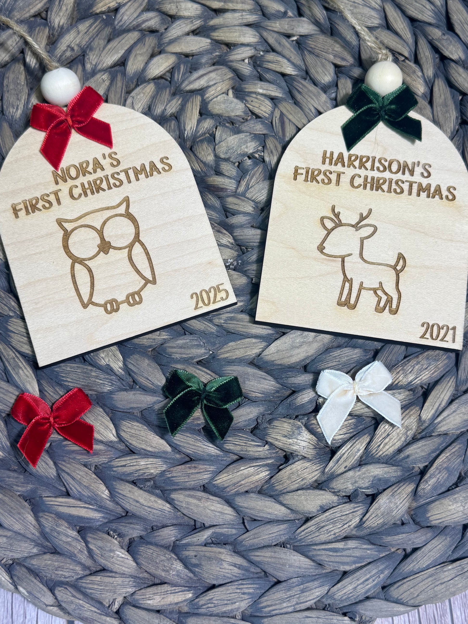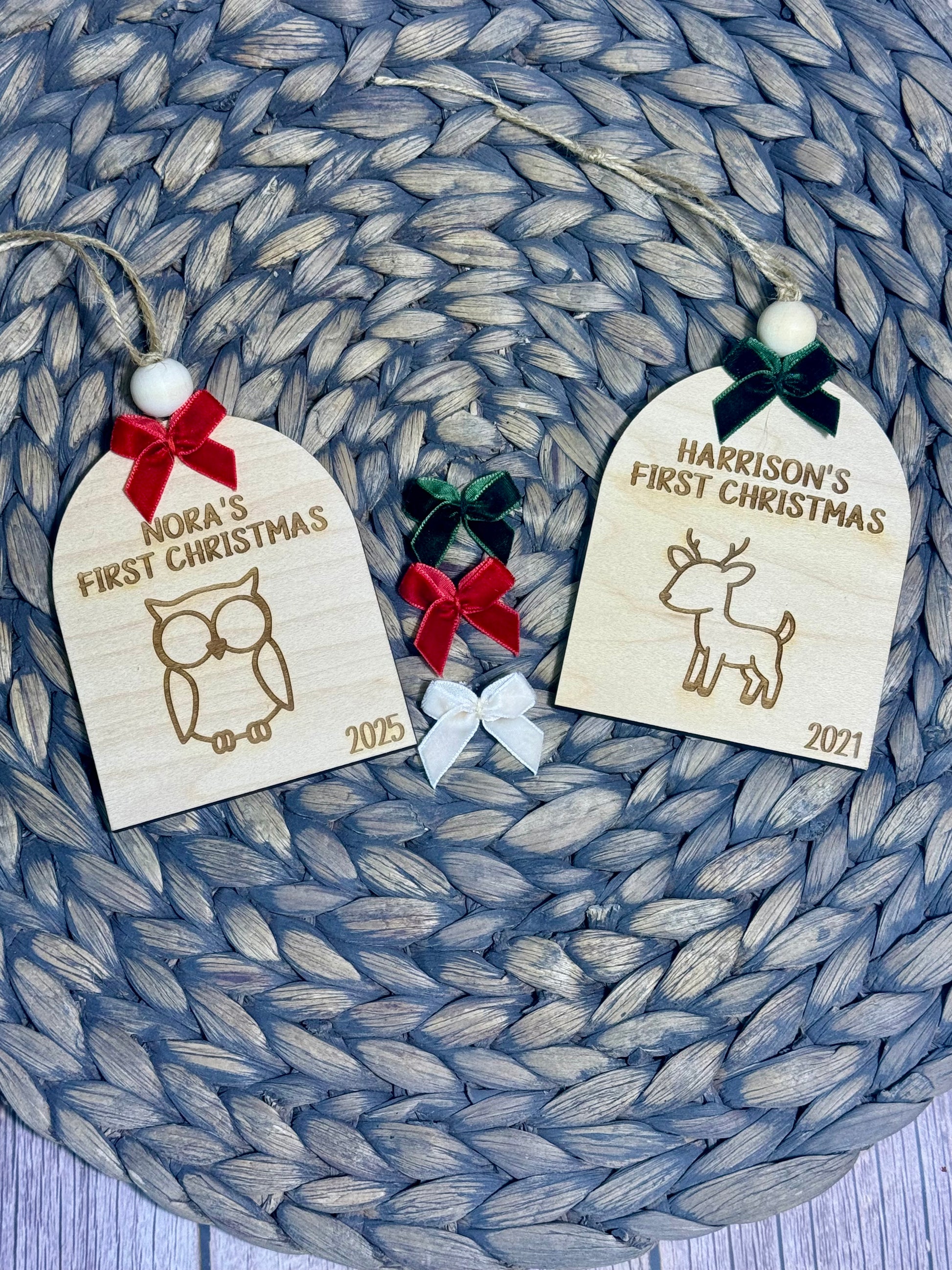 ornaments are laser engraved on 1/4” thick maple wood. There are 10 animals to choose from.
